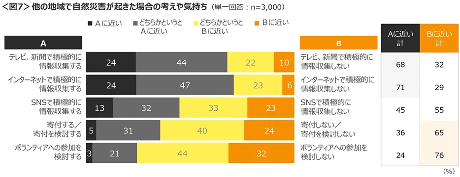 他の地域で災害が起きた場合、「テレビ・新聞」「インターネット」で積極的に情報収集する人は7割前後。一方、「ボランティアへの参加を検討する」「寄付をする/検討する」「SNSで積極的に情報収集する」は半数を下回る。災害時の偽情報や誤情報が広まりやすい傾向にあることからか、SNSでの積極的な情報収集は、テレビ・新聞、インターネットより低い結果となった。<図7>