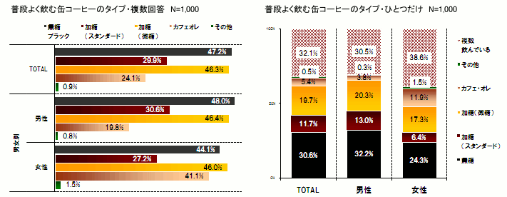 • 男性にも意外に多い「加糖・微糖」派、女性に多い「カフェ・オレ」派 午後から夜にかけては、「気分転換のために」