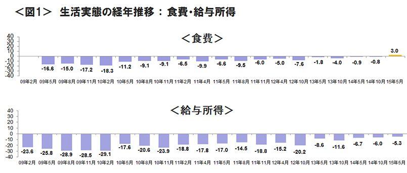 生活実態の推移として、【所得】項目のおいて、「食費」、「給与所得」では、2009年の調査開始以来の増加傾向が見られた。なかでも、「食費」は初めてプラスへと転じている <図1>