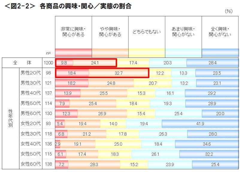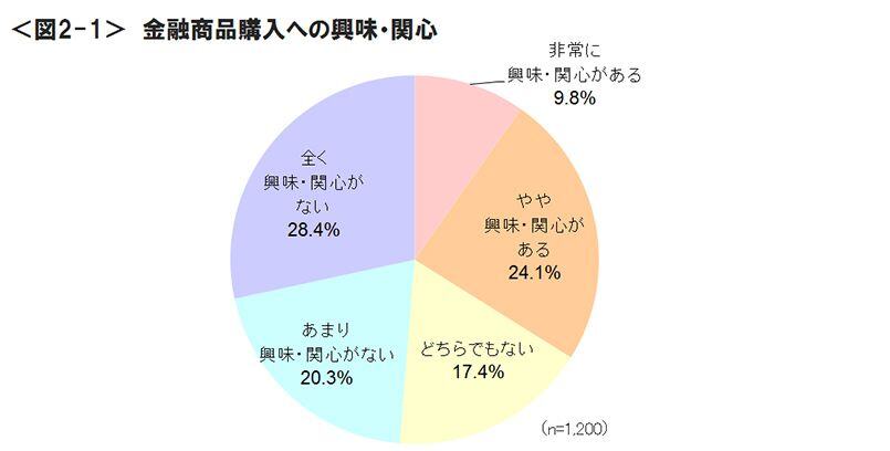 金融商品購入への興味・関心では、「非常に興味・関心がある」が9.8%、「やや興味・関心がある」が24.1%と、興味・関心が「ある」と回答した割合は全体で3割を超えている。性年代別では、興味・関心が「ある」と回答した人は女性より男性に多く、特に男性20代は51.1%と半数を超えている <図2-1><図2-2>