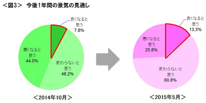 今後1年間の景気の見通しでは、「良くなると思う」と回答した方が13.3%で、前回2014年10月に調査をしたときよりも5.5%アップしている。さらに、「悪くなると思う」と回答した方は前回が44.0%に対し、今回が25.8%と、18.2%も減少。景況感としては、現状維持、もしくは景気向上すると考えている方が増えてきていることが窺えた <図3>