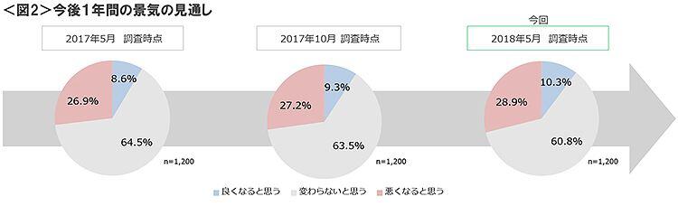 今後1年間の景気の見通しでは「良くなると思う」と回答した割合が【2017年5月調査】で8.6%、【2017年10月調査】で9.3%、今回の【2018年5月調査】で10.3%と上昇しており、景気の見通しに明るい傾向がみられる。<図2>