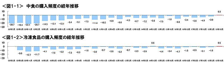中食(弁当や惣菜、宅配ピザなど)の購入頻度の経年推移をみると、2009年5月の調査以来、初めてプラスに転じた。また、冷凍食品の購入頻度も、2014年10月以来の調査開始後2度目のプラスとなった。共働き世帯や単身世帯の増加など社会構造の変化や、フードデリバリー(宅配)サービスが一般化してきていることが理由だと考えられる。<図1-1><図1-2>