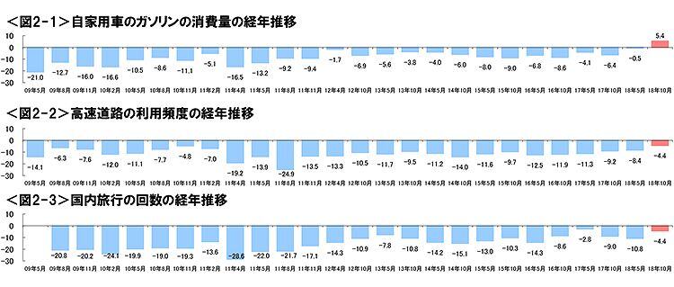 「自家用車のガソリン消費量」が17年10月から12ポイント上昇し、 2009年5月の調査以来初めてプラスに転じた。また、「高速道路の利用頻度」「国内旅行の回数」も増加しており、自家用車での旅行が増加している可能性がある。<図2-1><図2-2><図2-3>