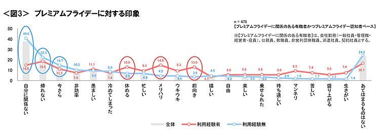 プレミアムフライデーを認知している有職者がプレミアムフライデーに抱いている印象は、全体では「自分に関係ない」(38%)、「帰れない」(22%)「今さら」(14%)といったネガティブな印象が上位に並んだ。一方で、利用状況別にみると、利用経験のある層では上記の項目に加え、「メリハリ」(15%)「休める」「前向き」(13%)といったポジティブな印象が高い指標になった。<図3>
