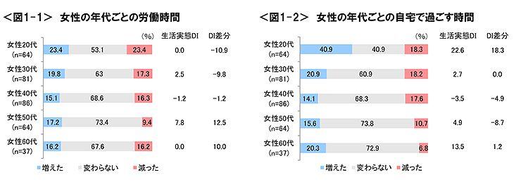 女性の労働時間のDI値が大きく変動した。20代・30代で約10ポイント減少するも、50代・60代で10ポイント以上の増加がみられた。一方で、自宅で過ごす時間は若い世代でDI値が増加している。社会的な動きと照らし合わせると若い世代では「働き方改革」を活用し労働時間を減らしているが、50代以上では老後の備えとして労働時間が増加している可能性がある。<図1-1><図1-2>