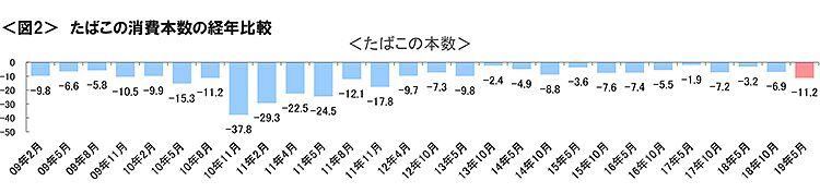 たばこの本数の購入が18年10月調査から2期連続で減少した。2018年10月からのたばこ税増税の影響とみられる。これまでの調査を通して大きく減少しているのは、2010年11月期(1本あたり3.5円の増税)や、2014年10月期(消費税増税)など、税負担率の増加がたばこ消費量に大きく影響しているものと思われる。<図2>