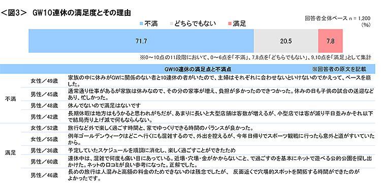 GWの10連休の満足度については72%が不満と回答した。特に家事の大半を担う主婦や仕事の給与形態によって、通常よりも家事負担や業務が増える、給料が減るといった不満を示す回答があった。連休を取得した人の中でも、「静養できた」と好意的な人もいれば「(休みが)長すぎる」と賛否両論があった。満足度の高い人の傾向としては、外出・休養バランスを取っていたり混雑の少ない場所を探し、近場を楽しむ様子が見られた。<図3>