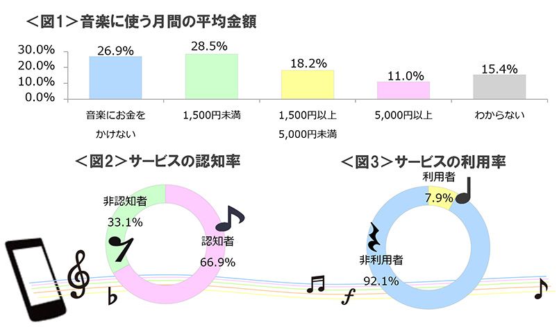 - サブスクリプション型音楽配信サービス、認知率が約70%に対して、利用率は約8%