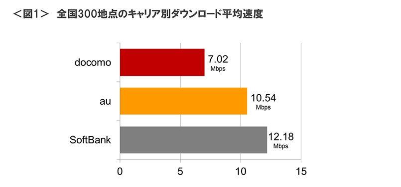 全国300地点のキャリア別ダウンロードの平均速度では、SoftBankが12.18Mbpsを記録して3社中トップ。以下、auが10.54Mbps、docomoが7.02Mbpsと続く <図1>