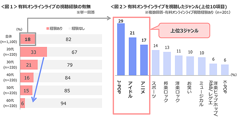 図1 有料オンラインライブの視聴経験の有無、図2 有料オンラインライブを視聴したジャンル