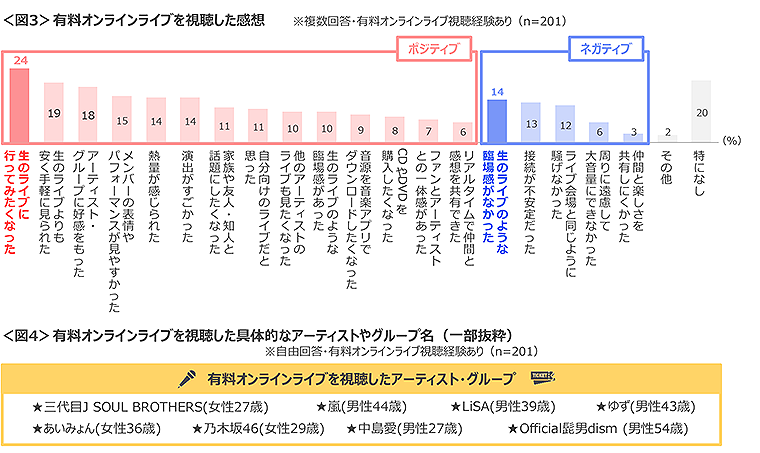 図3 有料オンラインライブを視聴した感想、図4 有料オンラインライブを視聴した具体的なアーティストやグループ名