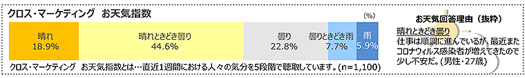 クロス・マーケティングお天気指数とは、直近1週間における人々の気分をお天気で表したものです。お天気の理由も一部抜粋してお知らせします。