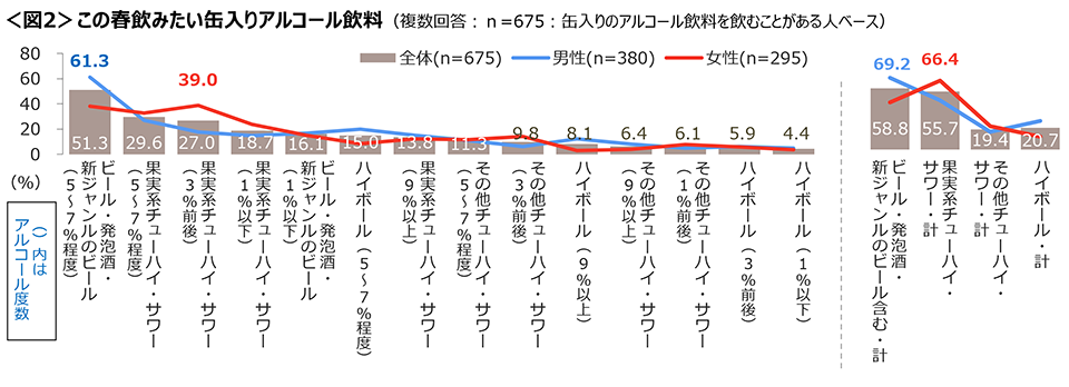 男性では「ビール・発泡酒」(69.2%)、女性では「果実系チューハイ・サワー」(66.4%)と傾向が異なる。また、いずれのタイプの飲料も、男性ではアルコール度数5%以上、女性では3%程度が好まれる様子。<図2>
