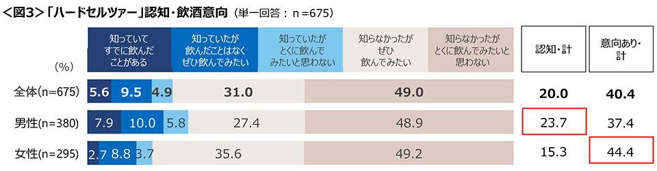 ◆「ハードセルツァー」の認知度は20.0%。認知問わず、飲酒意向は40.4%。