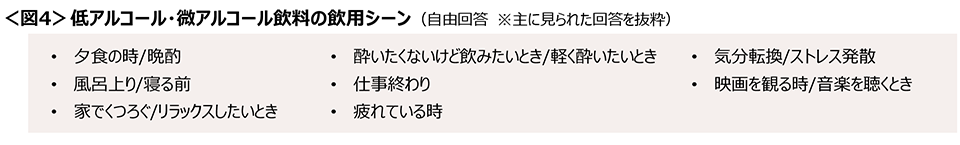 ◆低アルコール・微アルコールの飲用シーンとしては、食後や入浴後など家でくつろぐときや、酔いたくないけど飲みたいとき、気分転換やストレス発散といった回答が見られた。<図4>