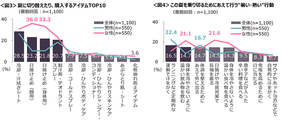 ◆夏に購入するアイテムは、「冷却・汗ふきシート」「日焼け止め(顔用)」「日焼け止め(身体用)」「制汗剤・デオドラントスプレー」が2割以上。女性は「日焼け止め」がトップ。<図3>