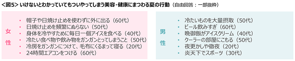 ◆いけないと思いつつもついやってしまう夏の行動は、女性は「日焼け対策を怠ること」。冷たいアイスやビールの食べ過ぎ・飲みすぎや、冷房に関する反省も目立つ。<図5>