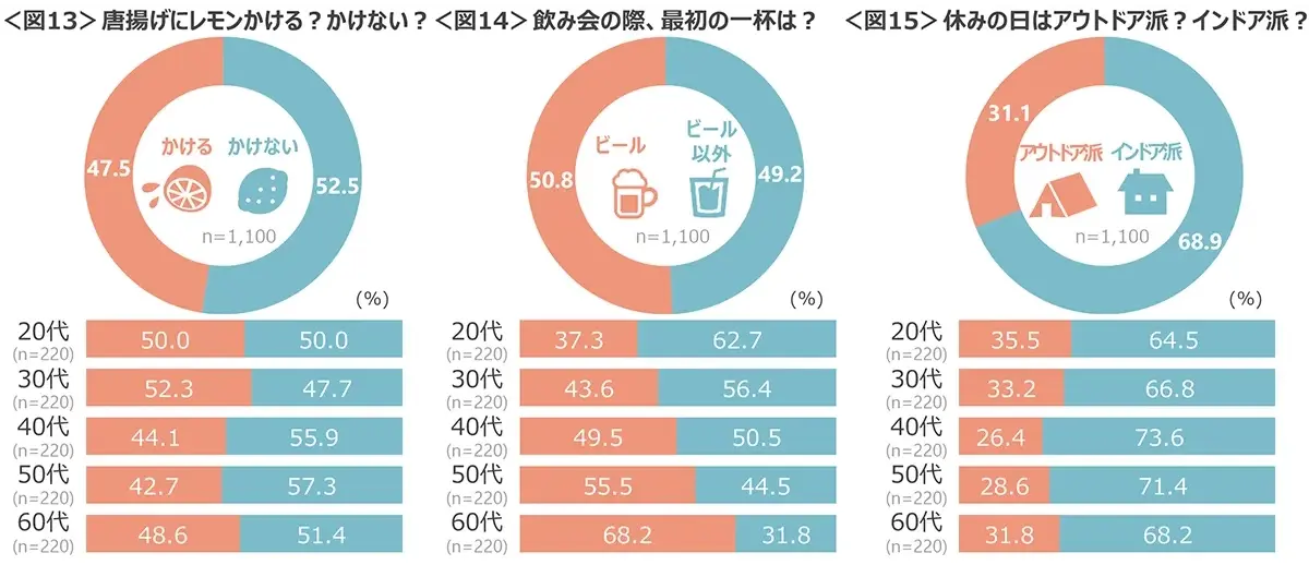 ・唐揚げにレモンを「かける」は47.5%、「かけない」が52.5%と半々。40代、50代は「かけない」派がやや多い。
