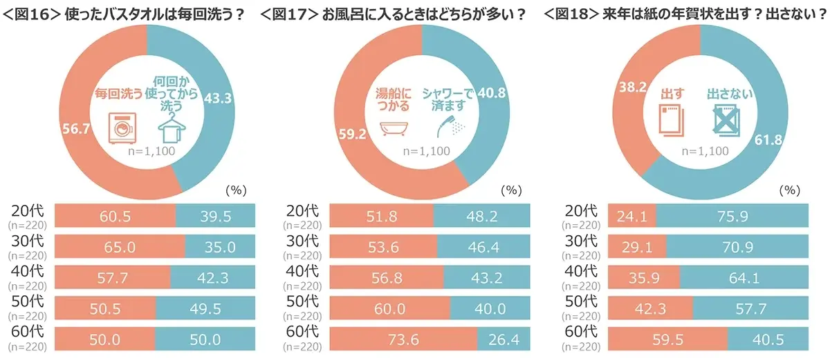 ・バスタオルは「何回か使ってから洗う」が43.3%、「毎回洗う」の方が56.7%とやや多い。20代、30代は「毎回洗う」が6割超え。