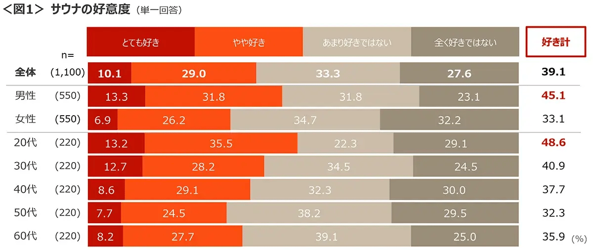 ◆サウナが好きな人は、39.1%。男性、20代で好きな人が多い。<図1>