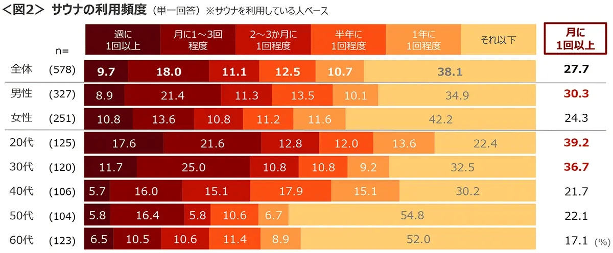 ◆サウナの利用頻度は、1年に1回未満が38.1%と最も多い。「月に1回以上」は27.7%。