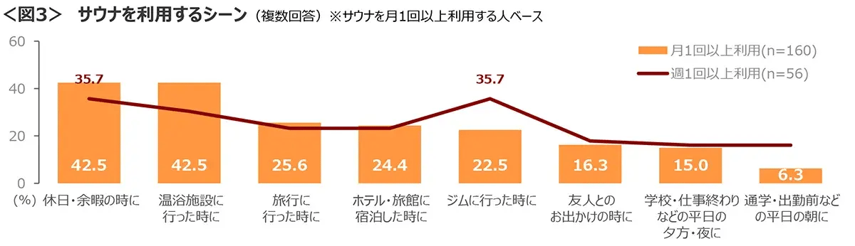 ◆利用するシーンは、月に1回以上利用する人では「休日・余暇の時」「温泉施設に行った時」が最多。