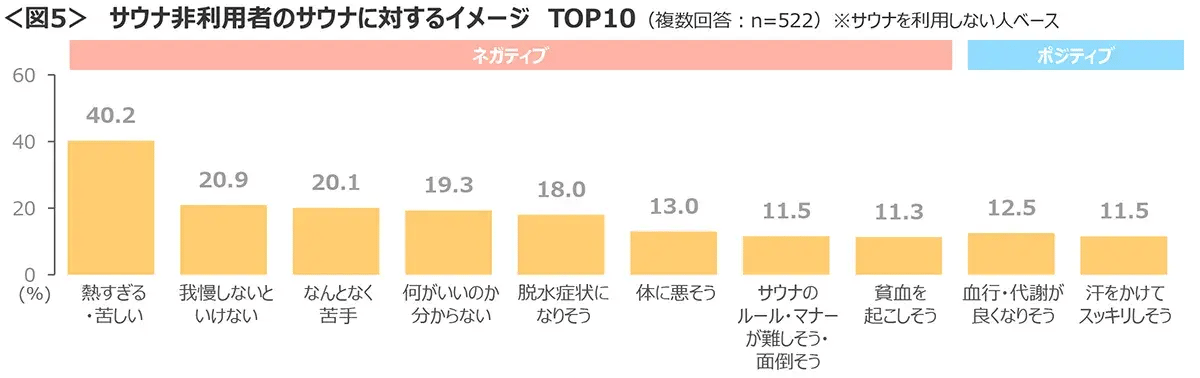 ポジティブなイメージとしては「血行・代謝が良くなりそう」「汗をかけてスッキリしそう」があげられるが、いずれも1割台と低く、サウナの良さが伝わっていない様子。<図5>