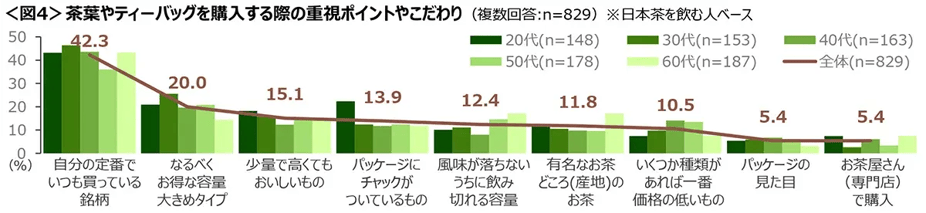 次いで、「お得な容量大きめタイプ」「少量で高くてもおいしいもの」が上位。20代では「パッケージにチャックがついている」、60代では「有名なお茶どころ(産地)」が他の年代に比べ重視している様子。<図4>