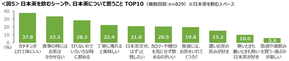 ◆日本茶を飲むシーンや、日本茶について思うことは「カテキンがとれて体にいい」「食事の時にお茶はかかせない」「甘くないのでいろいろな時に飲める」がTOP3で、健康面や飲用シーンの幅広さが評価されている。<図5>