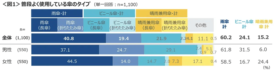 男性は「ビニール傘(長傘)」、女性は「晴雨兼用傘(折り畳み傘)」が高め。<図1>