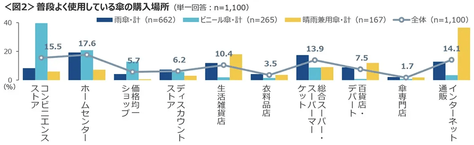 ◆雨傘は「ホームセンター」「総合スーパー・スーパーマーケット」、ビニール傘は「コンビニエンスストア」、晴雨兼用傘は「インターネット通販」で購入。<図2>