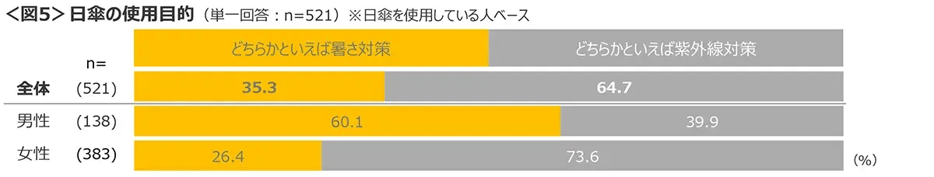 男性は「暑さ対策」、女性は「紫外線対策」で使用している。<図5>