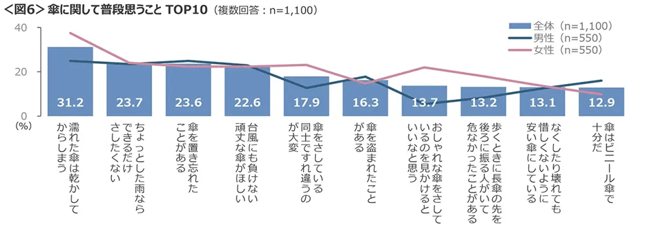 女性は「おしゃれな傘をさしているのを見かけるといいなと思う」が高く、傘はおしゃれアイテムのひとつとして考えている。<図6>