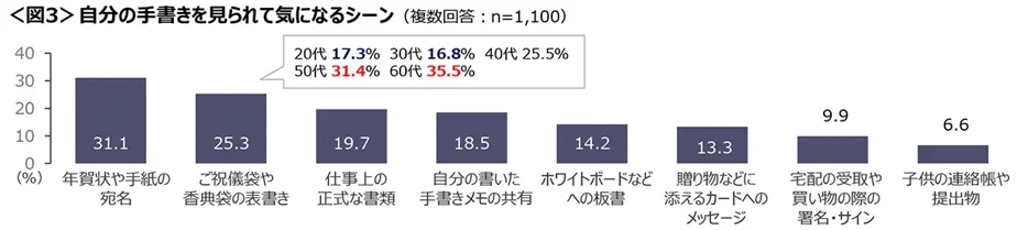 特に「ご祝儀袋や香典袋の表書き」は、年代が上がるにつれて懸念が高まる。<図3>
