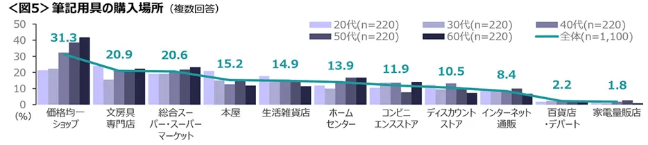 ◆筆記用具の購入場所は、「価格均一ショップ」「文房具専門店」「総合スーパー・スーパーマーケット」がTOP3。