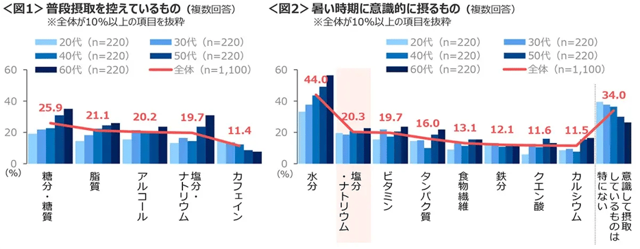 高齢層ほど「水分」を意識して摂取している。「塩分・ナトリウム」は年代による差はみられない。<図2>