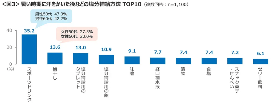 男性50~60代は「スポーツドリンク」、女性50~60代は「梅干し」の割合が高い。<図3>