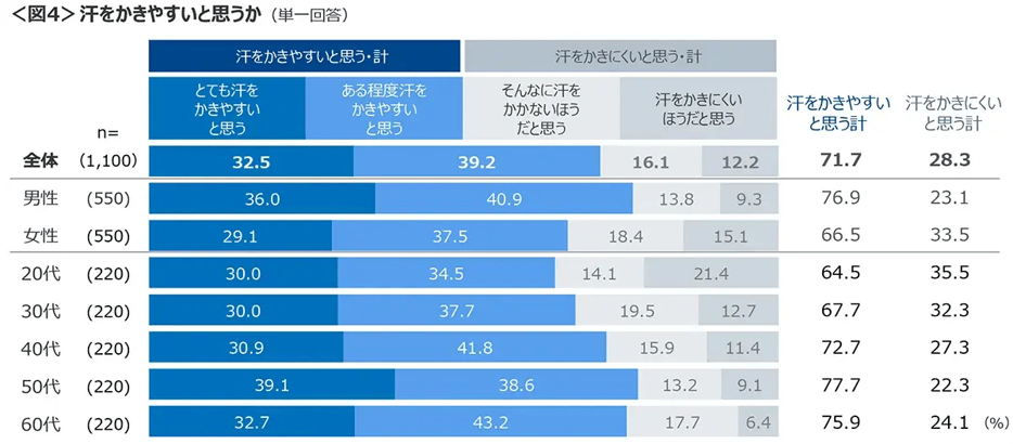 男性、50~60代は汗をかきやすいと思う人が多く、特に50代は「とても汗をかきやすいと思う」が約4割を占める。<図4>