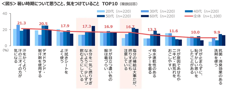 年代が高いほど、「水分を一気に摂りすぎないように、少しずつ飲むようにしている」「塩分の補給は大事だが、摂りすぎにも注意している」が高い傾向。<図5>