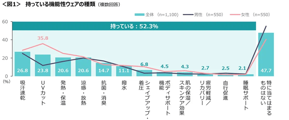 ◆機能性ウェアを持っている割合は52.3%。保有率が高いものは、「吸汗速乾」 「UVカット」「発熱・保温」「涼感・放熱」が2割台。