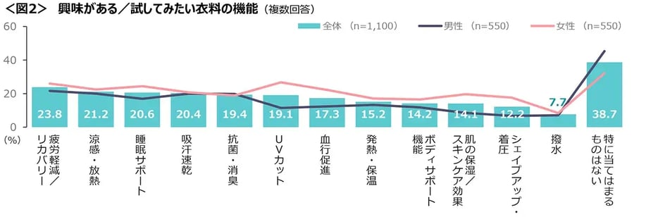 「疲労軽減/リカバリー」「睡眠サポート」の機能がある服の保有率は3%未満と低いものの、興味を持たれている。<図2>