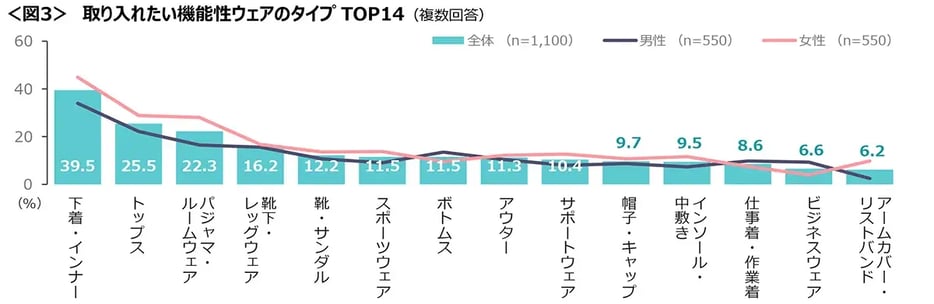 ◆取り入れたい機能性ウェアのタイプは、「下着・インナー」が39.5%で最も高い。次いで、「トップス」「パジャマ・ルームウェア」が2割台で続く。