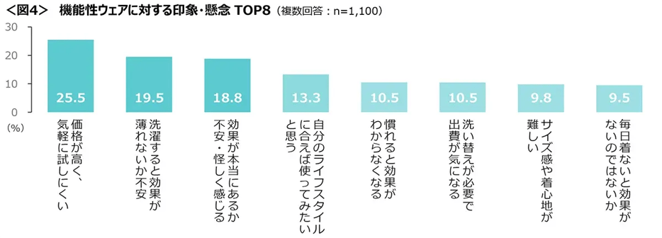 ◆機能性ウェアに対する印象や懸念は、「価格が高く、気軽に試しにくい」「洗濯すると効果感が薄れないか不安」「効果が本当にあるか不安・怪しく感じる」が上位。価格に対する抵抗感や取り扱い・効果感への不安が見受けられる。<図4>