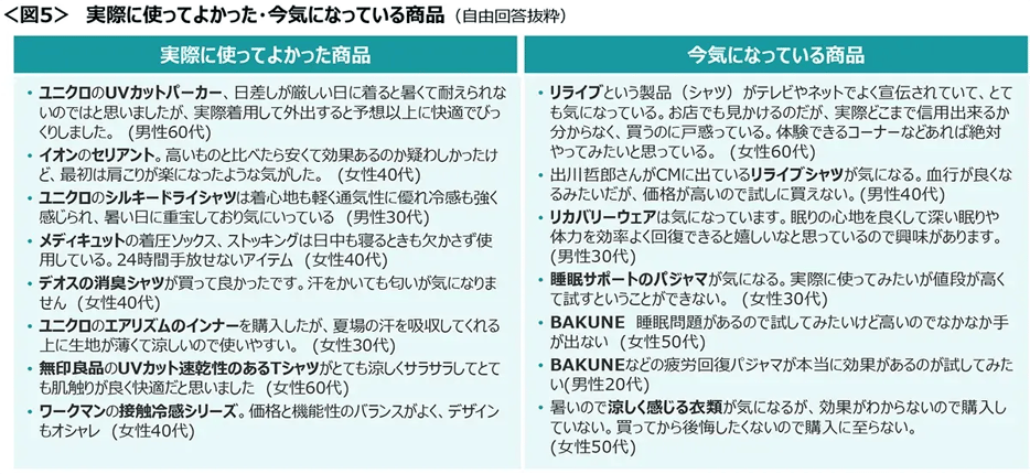 ◆実際に使ってよかった商品は、涼しさや吸汗・消臭といった機能性に加え、価格以上の価値を感じられる高コスパなアイテムが多くあがった。一方、今気になっている商品では、リカバリーウェアや睡眠改善系のウェアに関心が集まっており、価格の高さや効果への不安から購入をためらう声とともに、体験機会を求める意見もみられた。<図5>