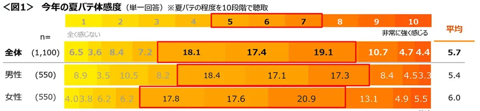 女性の方が「7」以上の回答が多く、男性より夏バテを強く感じている傾向にある。<図1>