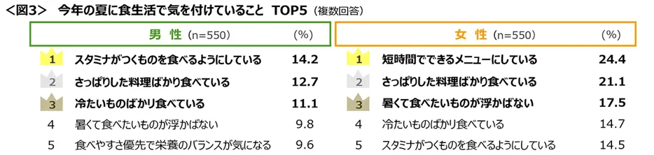 ◆今年の夏に食生活で気をつけていることは、男性は「スタミナがつくものを食べる(14.2%)」、女性は「短時間でできるメニューにしている(24.4%)」がトップ。