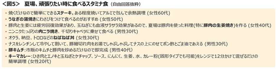 ◆夏場、頑張りたい時に食べるスタミナ食は、ステーキやうなぎといったスタミナのつくイメージがある定番食から、電子レンジ調理や焼くだけで完成する手軽なメニューなどがあげられた。<図5>