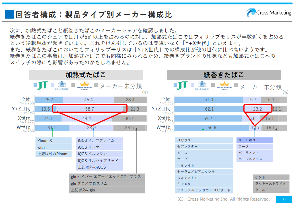 加熱式たばこは、世界の中でも日本が先行した市場であり、グローバル展開にあたり日本の動向が注目されており、日本市場では、IQOS、glo、ploomといったブランドがありますが、IQOSがトップシェアにあります。