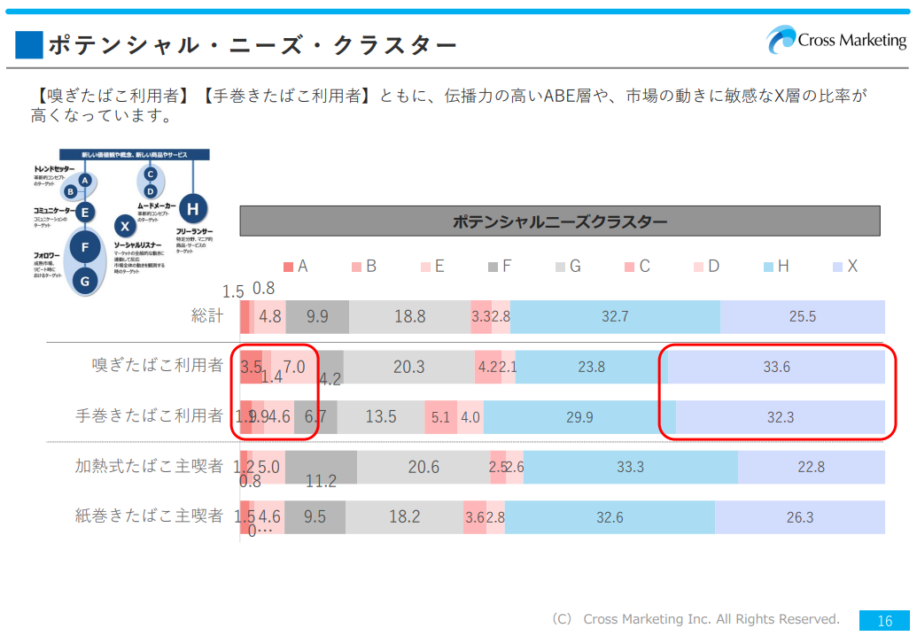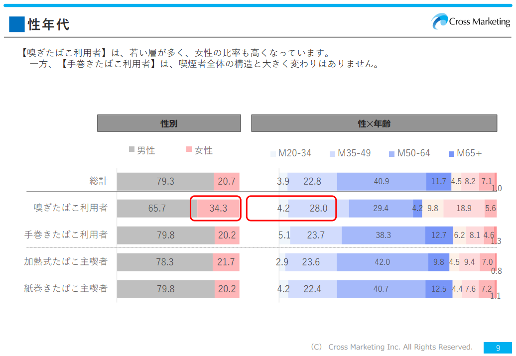 本資料では当社の喫煙周りのモニターデータベース情報を使用し、【嗅ぎたばこ】と【手巻きたばこ】の利用者の特徴を「紙巻きたばこ」や「加熱式たばこ」の主喫煙者と比較することで明らかにしました。